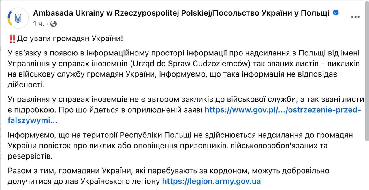 "Управление по делам иностранцев не является автором призывов к военной службе, а так называемые письма являются подделкой. На территории Республики Польша не осуществляется отправка гражданам Украины повесток о вызове или оповещении призывников, военнообязанных и резервистов", - сообщает посольство.