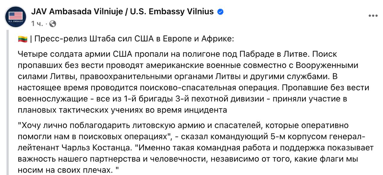 Пентагон не готов подтвердить информацию о гибели четырёх американских военных после плановых учений, их поиски всё ещё продолжаются. Об этом заявил официальный представитель Сухопутных войск США.