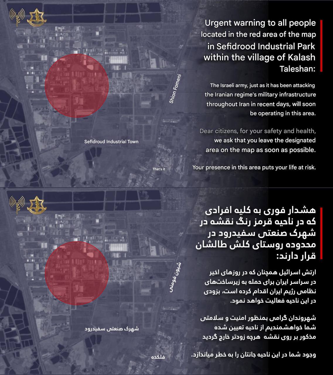 ЦАХАЛ выпустил заявление на арабском и фарси, в котором потребовал немедленной эвакуации работников и жителей, находящихся в районе промышленного парка Сефидруд, расположенного в деревне Колеш Талешан возле города Решт на северо-западе Ирана.