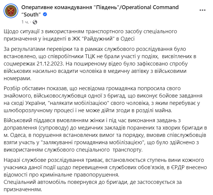 Инцидент с «мобилизацией на скорой» в Одессе: в ОК «Юг» утверждают, что сотрудники ТЦК не причастны к вчерашней ситуации