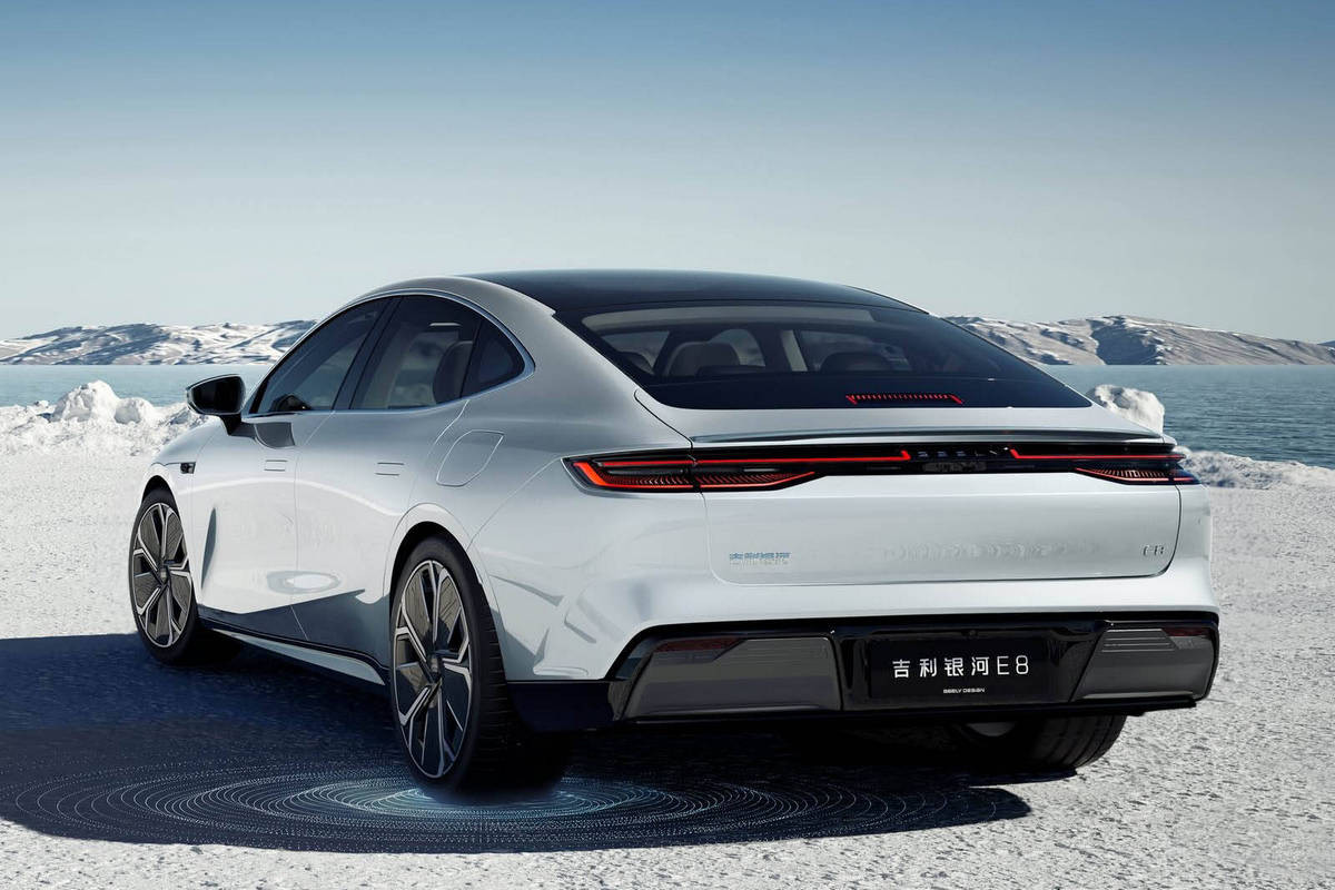 Geely Galaxy E8 построен на платформе SEA (Sustainable Experience Architecture), тогда как Galaxy L6 и Galaxy L7 базируются на «тележке» E-CMA (разновидность CMA, Compact Modular Architecture). Длина флагмана равна 5010 мм, ширина – 1920 мм, высота – 1465 мм, расстояние между осями – 2925 мм. То есть по своим габаритам E8 сопоставим с электроседаном Exeed Sterra ES/Exlantix E03. Объявлено, что коэффициент аэродинамического сопротивления Cd новинки Geely составляет всего 0,199.