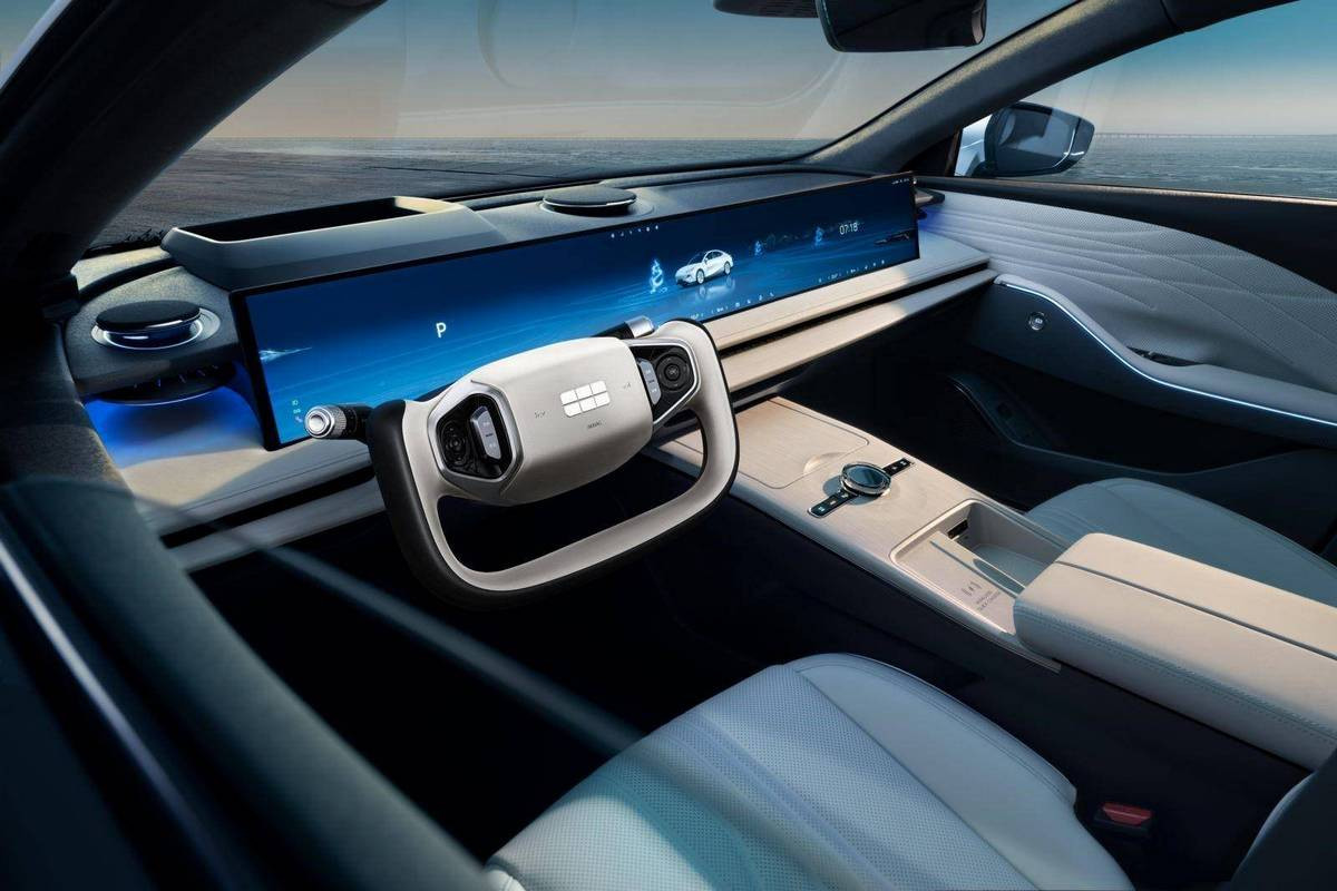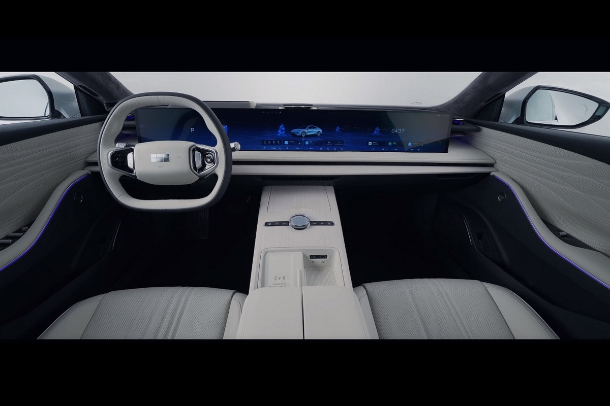 В салоне – единый 45-дюймовый дисплей во всю ширину передней панели. Китайцы пишут, что экран имеет разрешение 8К, антибликовое покрытие и защиту от отпечатков пальцев. Электроника – с чипом Qualcomm Snapdragon 8295. А вот руль не тот, что был на предыдущих фирменных картинках: раньше Geely демонстрировала E8 со штурвалом, теперь же у машины двухспицевая усеченная «баранка». Впрочем, вполне возможно, что тот, первый, вариант предложат в качестве опции. Модели также обещаны система распознавания лиц, проекционный дисплей, вентиляция и обогрев сидений (передние кресла – еще и со встроенными в подголовники динамиками).