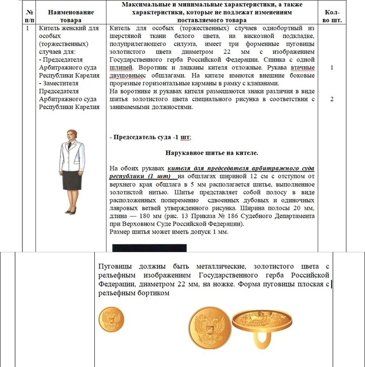 В закупочной документации указано, что на форменных пуговицах одежды для судей будет изображен герб России, а некоторые ее детали будут вышиты золотистым цветом.