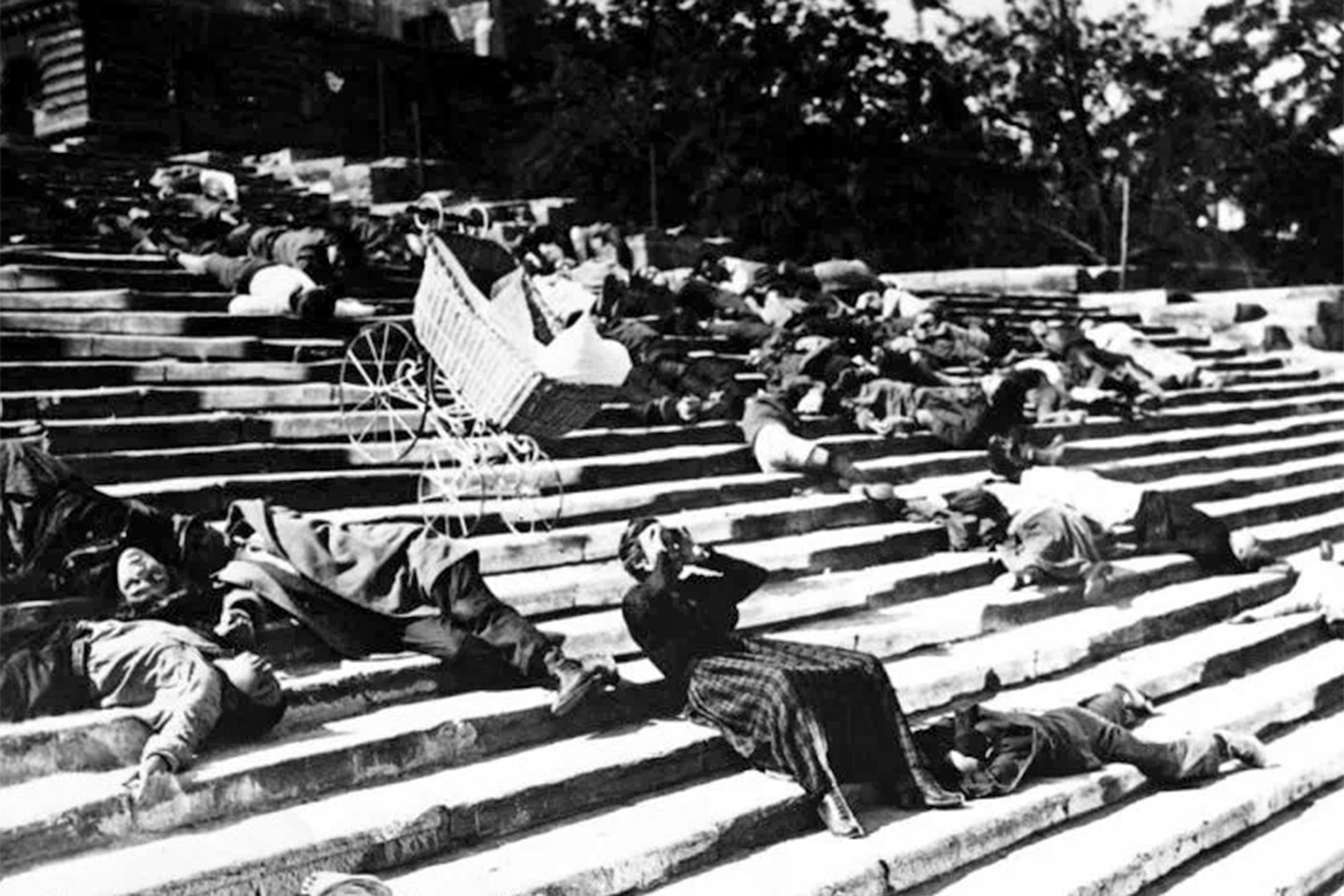 "Броненосец "Потемкин"" (1925 г.) - революционная кинокартина Сергея Эйзенштейна, вошедшая в золотой фонд мирового кино и не раз в различных опросах критиков, режиссеров и киноведов признававшаяся одним из лучших фильмов всех времен. Кадр с коляской, катящейся по Потемкинской лестнице, не раз так или иначе обыгрывался в разных фильмах. Картина была создана в 1925 году к 20-летию первой русской революции. В 1926 году фильм получил приз на Всемирной выставке в Париже.