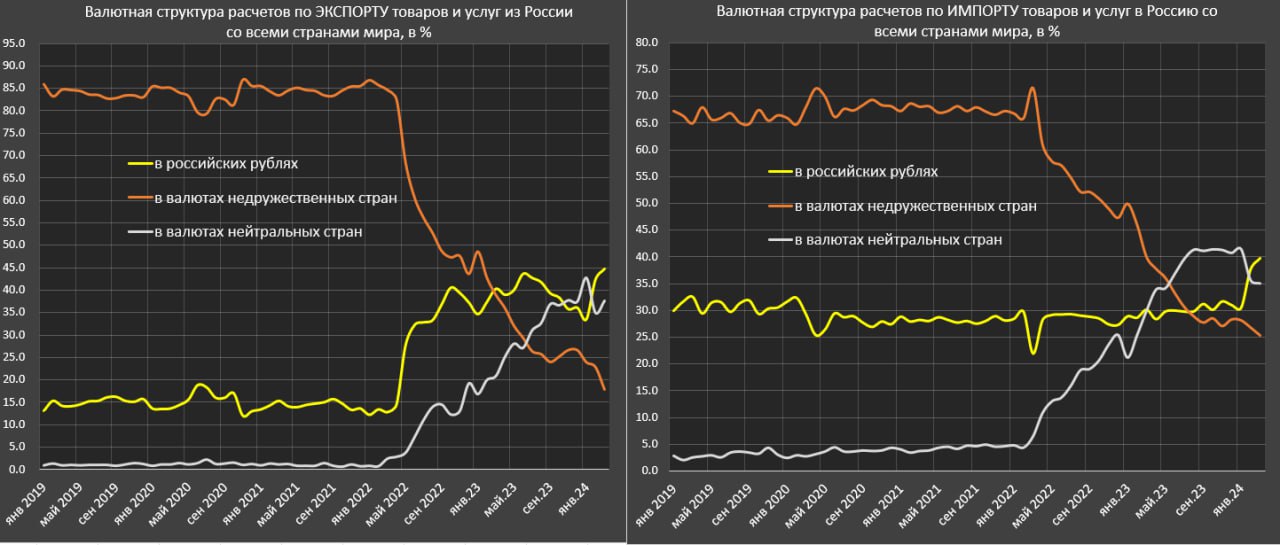 В России отмечается резкое падение расчетов по экспорту в недружественных валютах с февраля 2024.
