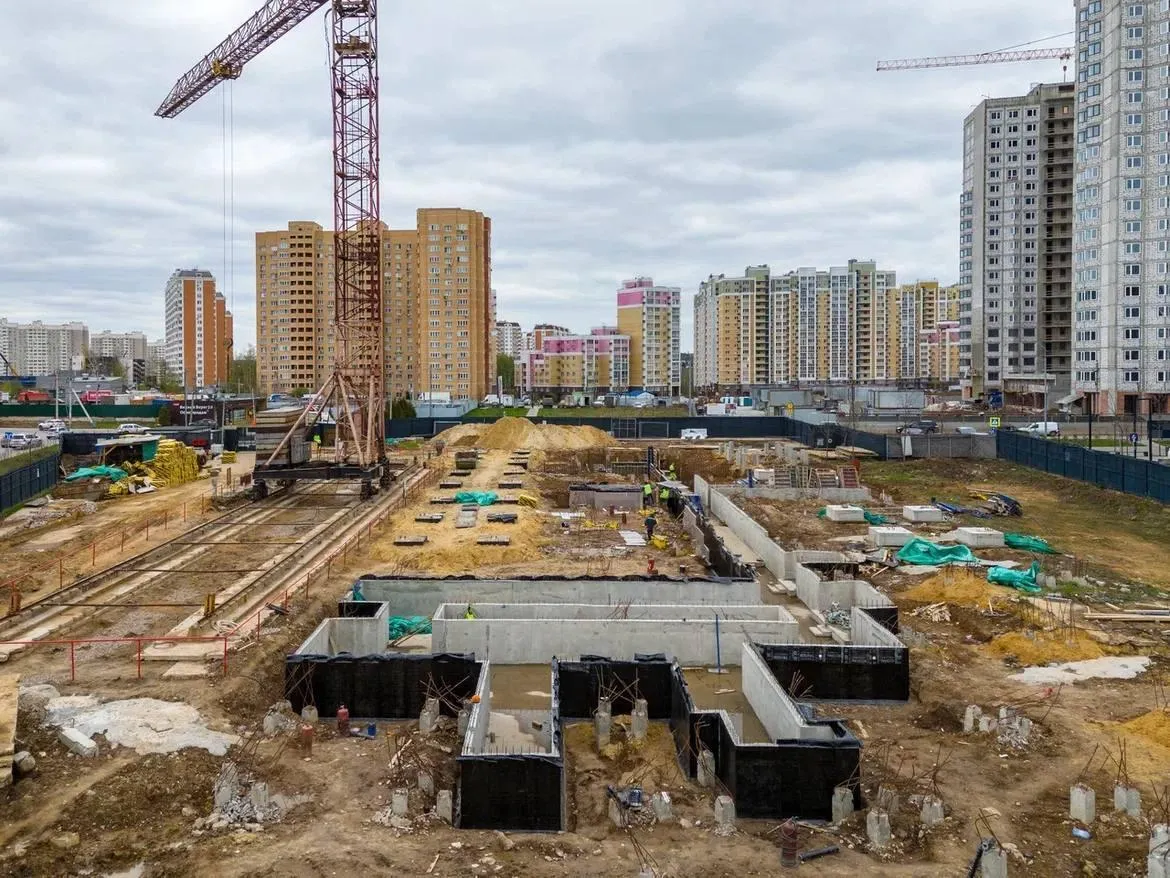 Строители залили плиту фундамента и начали вязать вертикальные конструкции, выполнили теплоизоляцию и провели гидроизоляцию. Сейчас возводят монолитный каркас.