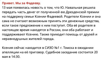 В Telegram-канале сторонников Фадеевой вскоре появился пост, в котором говорится, что ни сама Ксения, ни ее родители «не считают возможным принять эти денежные средства, если такое предложение к ним поступит».