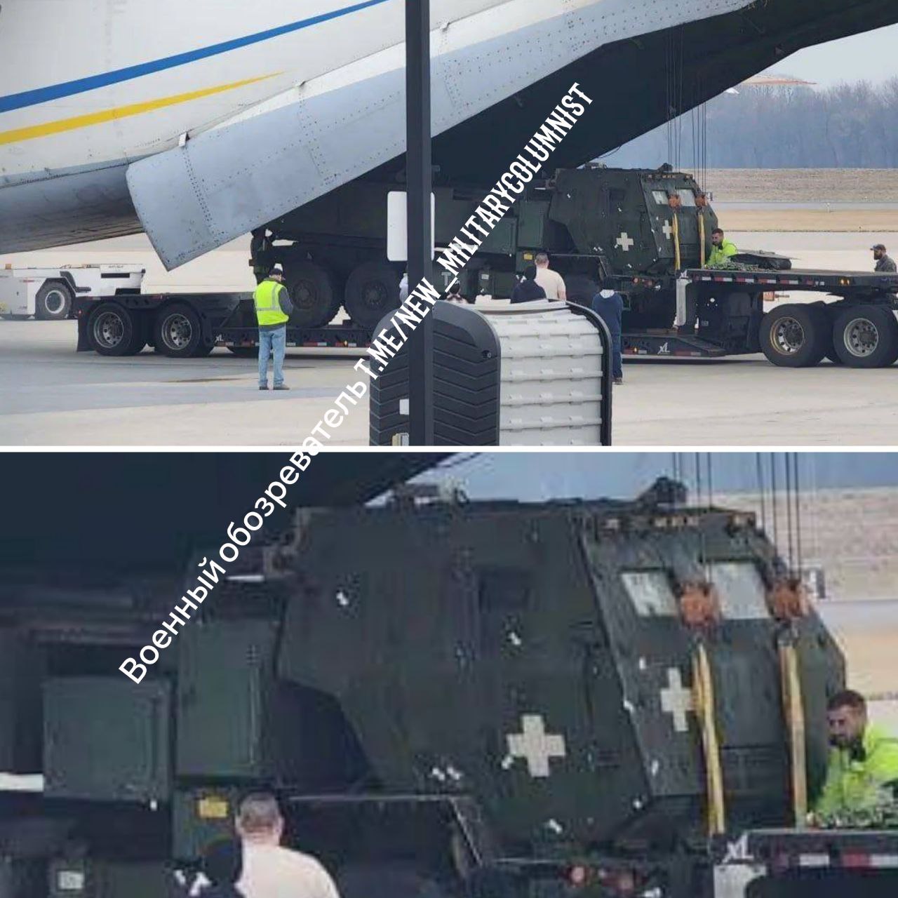 Поврежденный в результате близкого прилёта американский РСЗО HIMARS ВСУ отправляется на ремонт на борту украинского военно-транспортного самолёта.