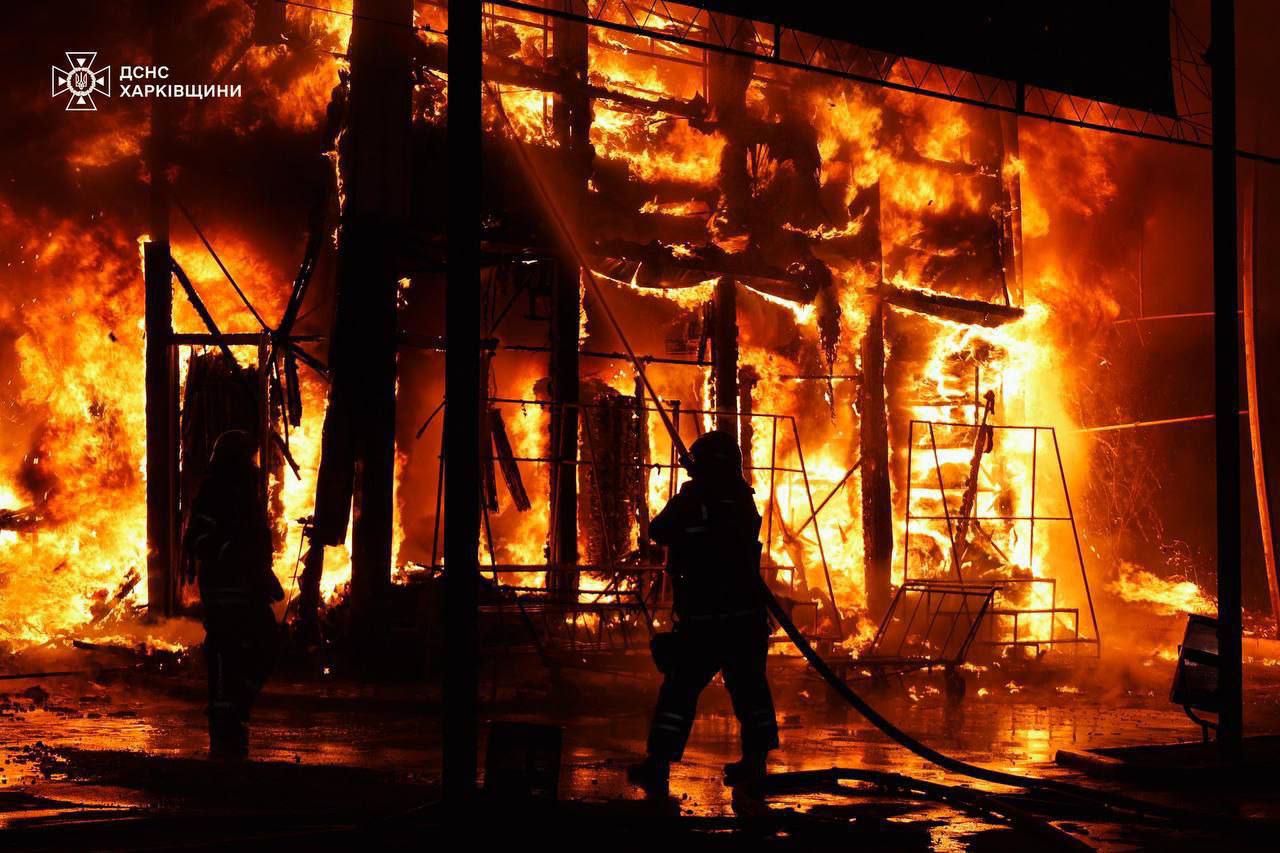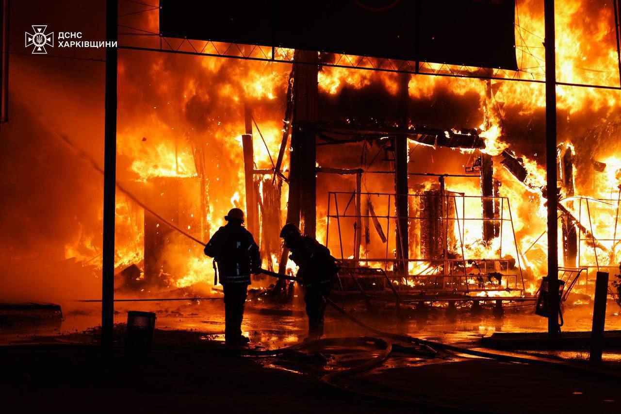 В Киевском районе возник крупный пожар: на площади около 2800 квадратных метров загорелись торговые павильоны. В Салтовском районе зафиксированы более серьёзные разрушения — повреждён жилой дом, после чего вспыхнул огонь. Также пламя охватило территорию гаражного кооператива, где огонь распространился на площади в 350 квадратных метров.