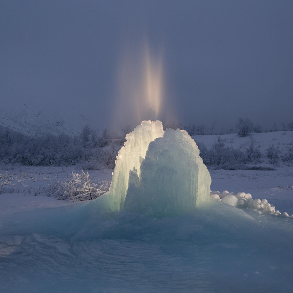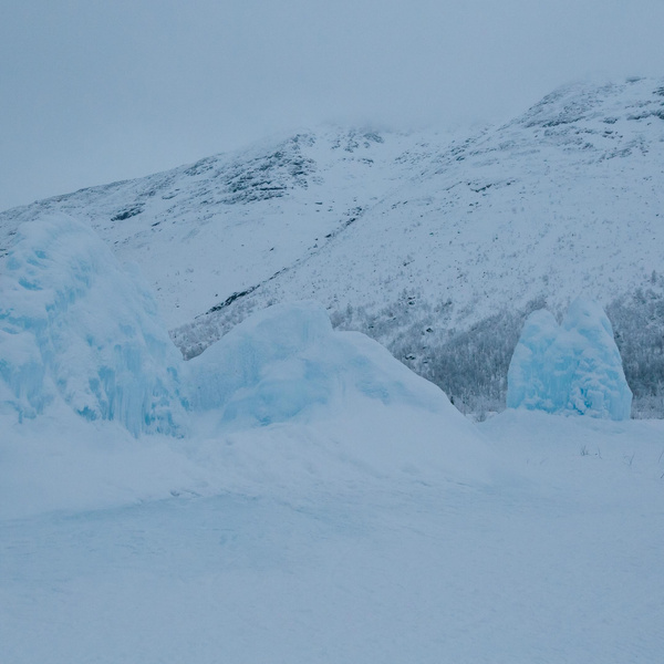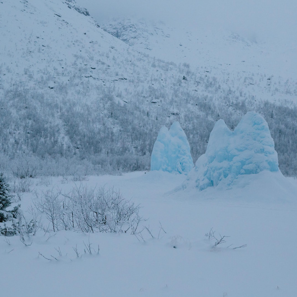 Еще одно удивительное явление, возникшее благодаря командной работе природы и человека, — Хибинские «фонтаны». Чтобы добраться до них, нужно доехать до кировского санатория «Тирвас», а потом по накатанной дороге или по снегоходному следу пройти примерно два километра к долине озера Малый Вудъявр. Здесь, в окружении снежных полей, возвышаются голубоватые ледяные истуканы.