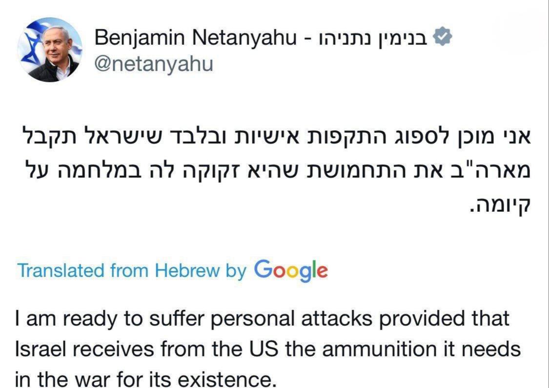 🇮🇱 Нетаньяху готов терпеть личные нападки при условии, что Израиль получит от США боеприпасы для ведения боевых действий