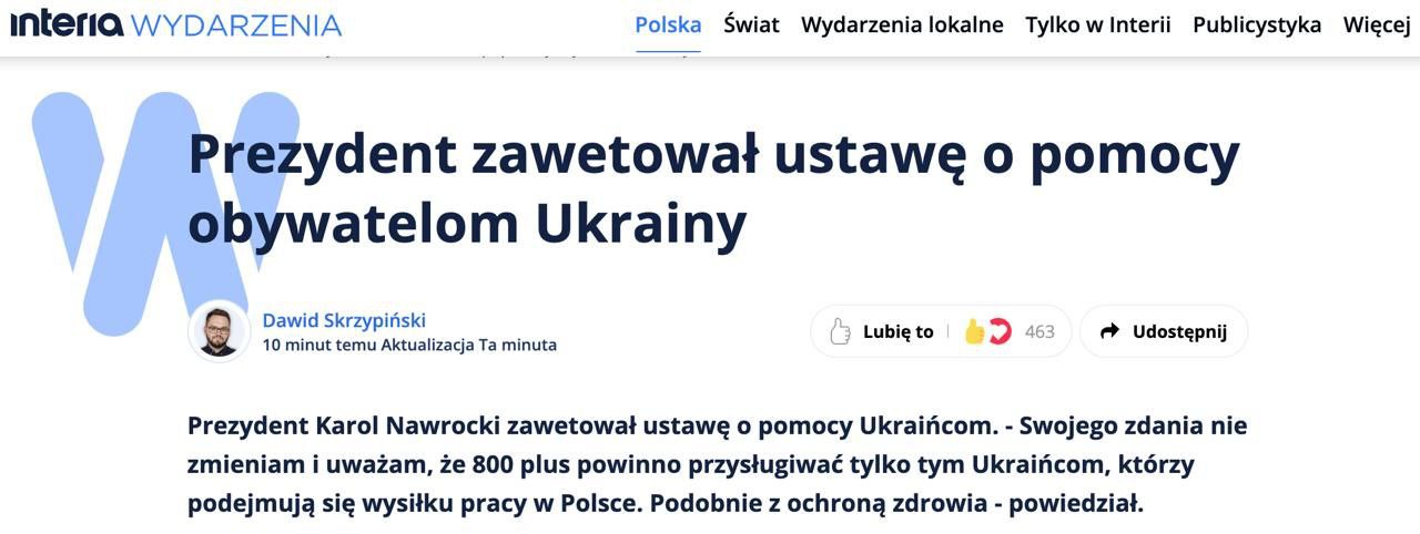 Президент Польши наложил вето на законопроект о продлении финансовой и медицинской помощи неработающим гражданам Украины — сообщает Wydarzenia.