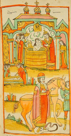 Крещение княгини Ольги и смерть князя Олега от укуса змеи, Лицевой хронограф Фёдора III, XVII в. Н. И. Костомаров дает не лишенную верных наблюдений, но однобокую характеристику правлению первых князей на Руси: