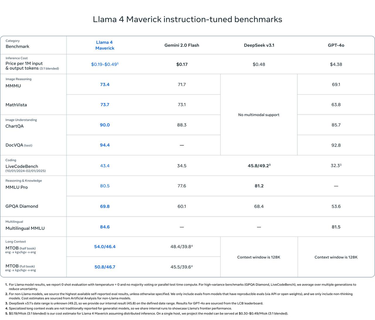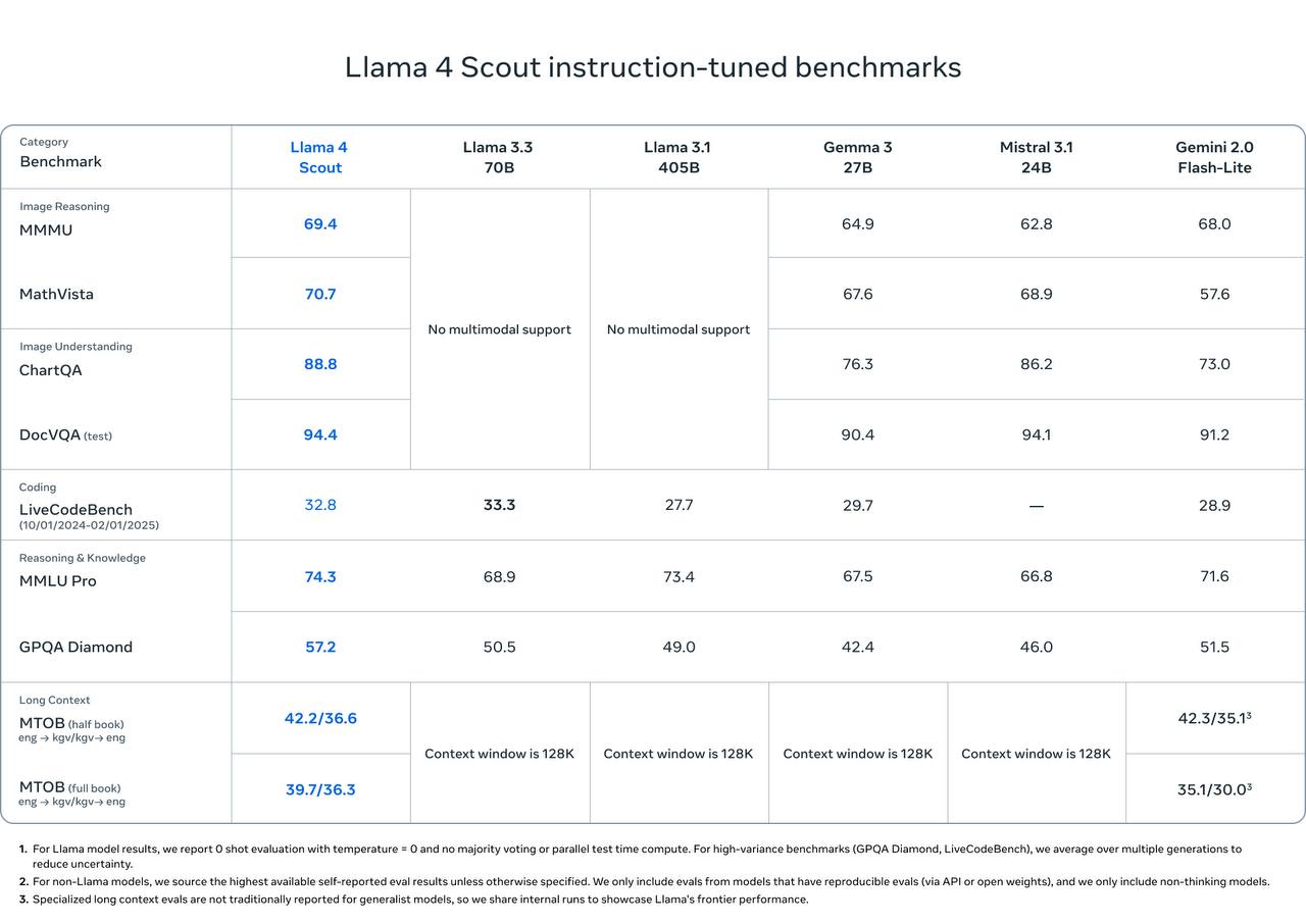 – Maverick. Более продвинутая модель с контекстом 1 млн токенов. Лучшая из нового семейства по работе с текстом и кодом. В тестах обошла GPT-4o;