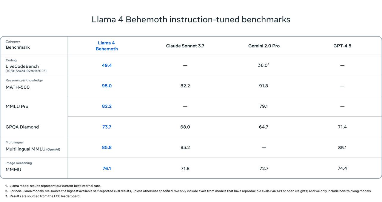 – Behemoth. Использовалась для обучения младших моделей. По ряду бенчмарков обгоняет GPT-4.5, Claude Sonnet 3.7, Gemini 2.0 Pro.
