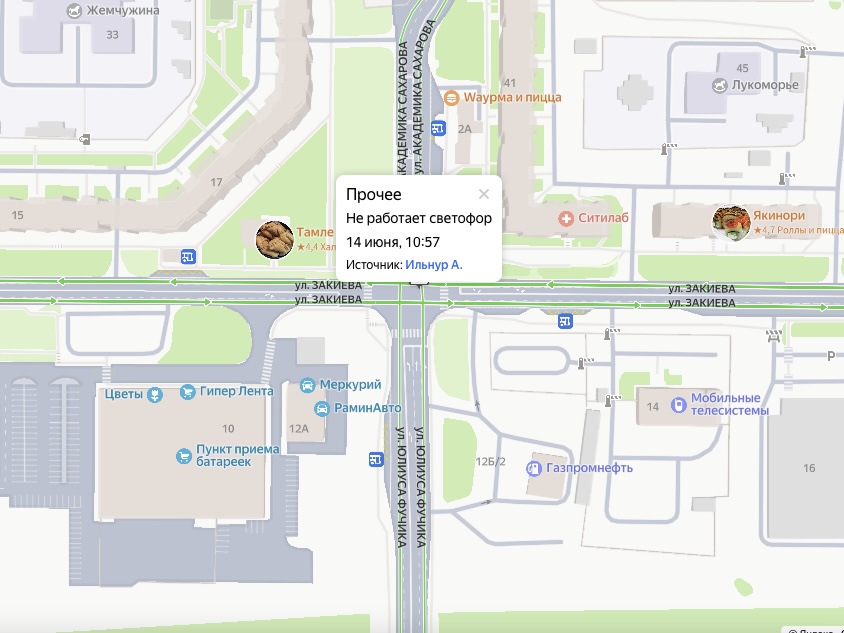 Кроме того, не работает светофоры на пешеходных переходах перекрестка улиц Сахарова и Закиева рядом с гипермаркетом «Лента».