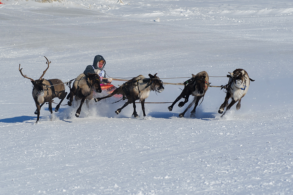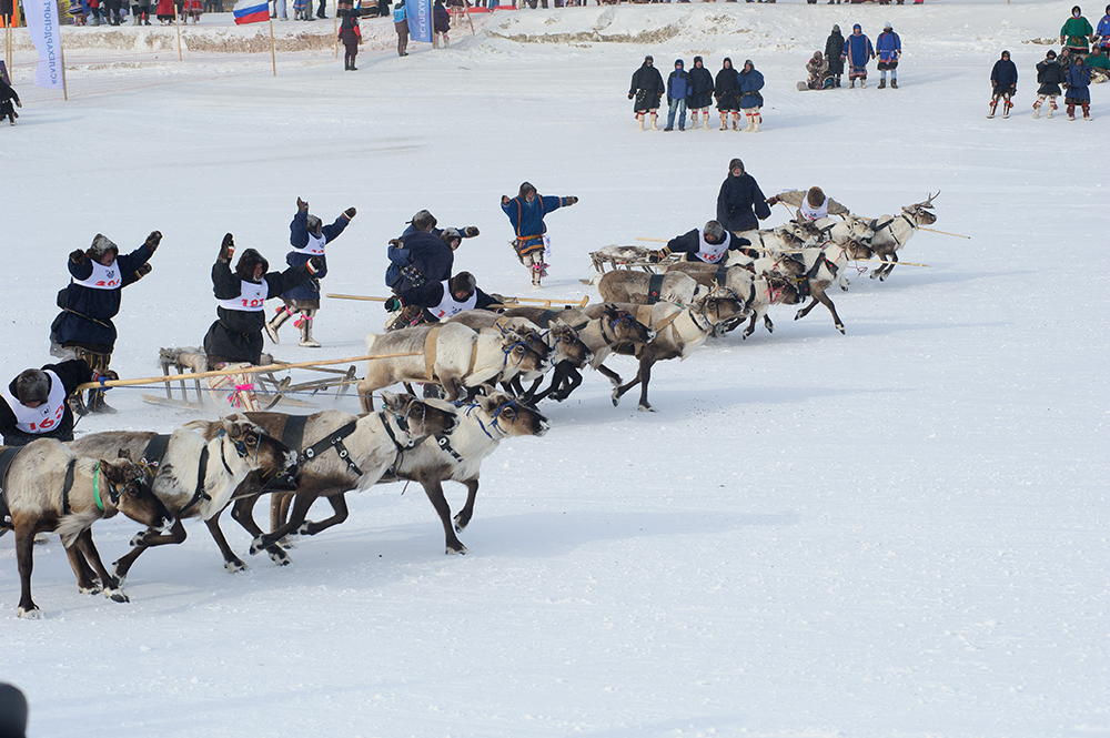 Дистанция небольшая, два километра. В каждой упряжке — по пять оленей. На старте погонщик сначала бежит вместе с упряжкой, и только потом запрыгивает в нарты. А дальше подгоняет оленей длинным трехметровым шестом — хореем.