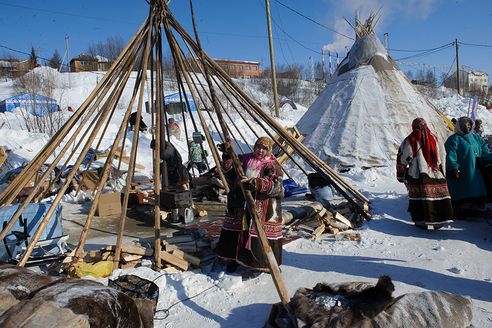 Площадь чума около 26 м². В его основе 40 еловых жердей, которые сверху покрывают оленьими шкурами, сшитыми вручную в большие полотнища. Зимой такими полотнищами чум оборачивают трижды, чтобы сохранить тепло. Летние «стены» чума — из брезента. Строят чум только женщины и дети. Удивительным образом у них уходит на это всего 40 минут.Но главное мероприятие Дня оленевода — спортивные состязания: перепрыгивание нарт, перетягивание палки и даже этнобиатлон. И конечно — гонки на оленьих упряжках.