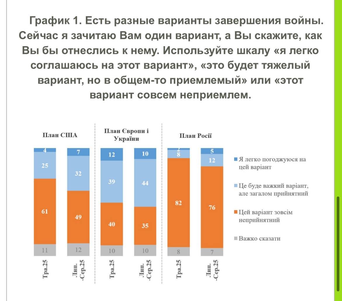 54% украинцев готовы поддержать мирный план, по которому «Россия сохранит контроль над занятыми территориями, но Украина и мир официально этого не признают», а «США постепенно снимут санкции с РФ».
