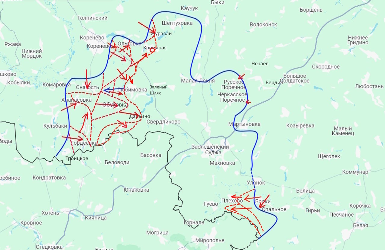 Здесь наши войска продолжают атаковать в районе Плёхово, которое отрезано от остальных сил противника (а в тылу у него довольно полноводный Псёл. Идет штурм села и ждем отсюда хороших известий.