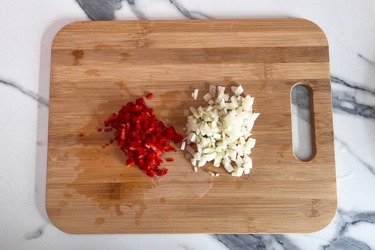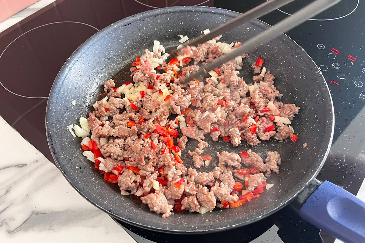 Шаг 2. Пока фарш жарится, мелко нарежьте половину луковицы и перца.