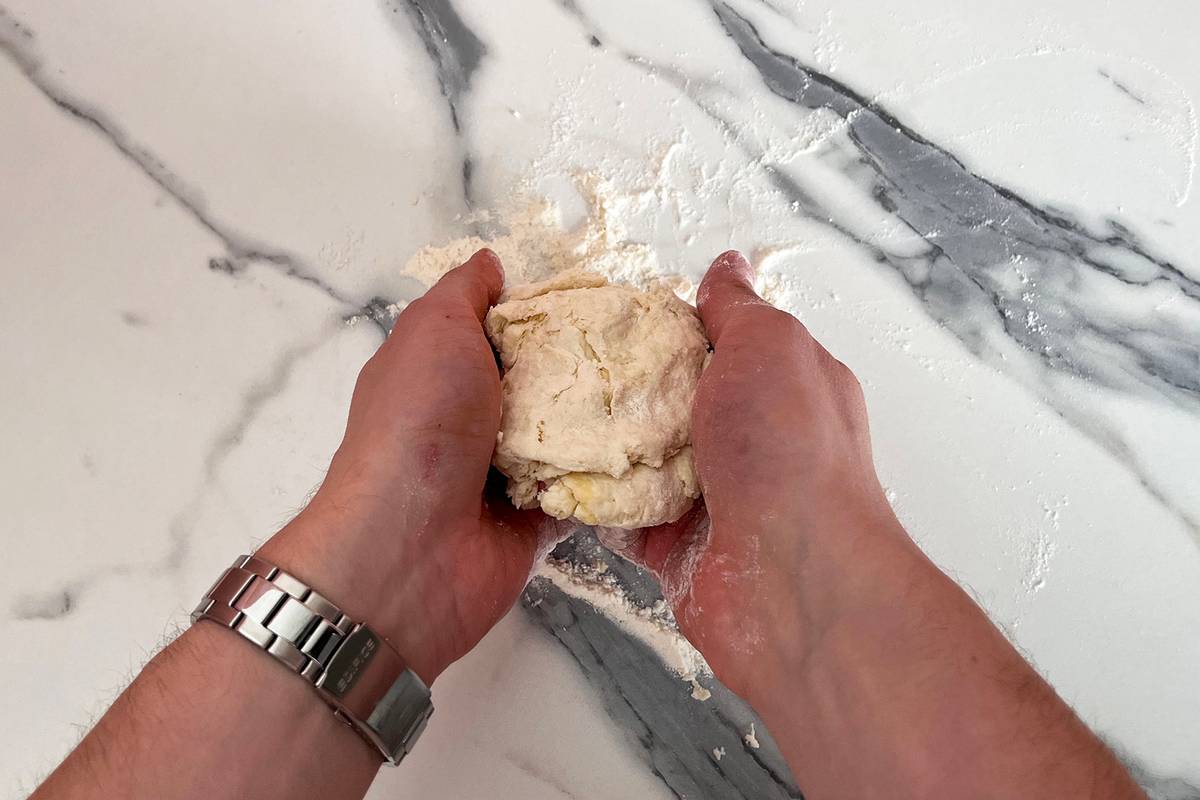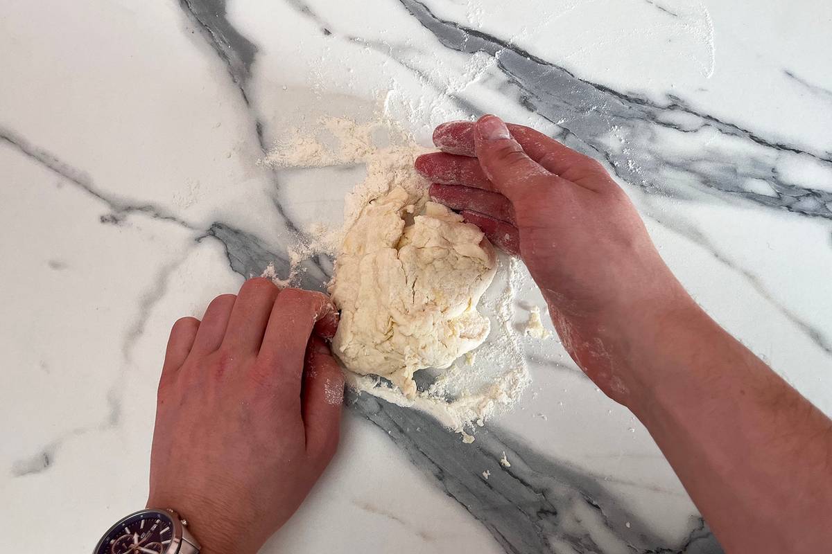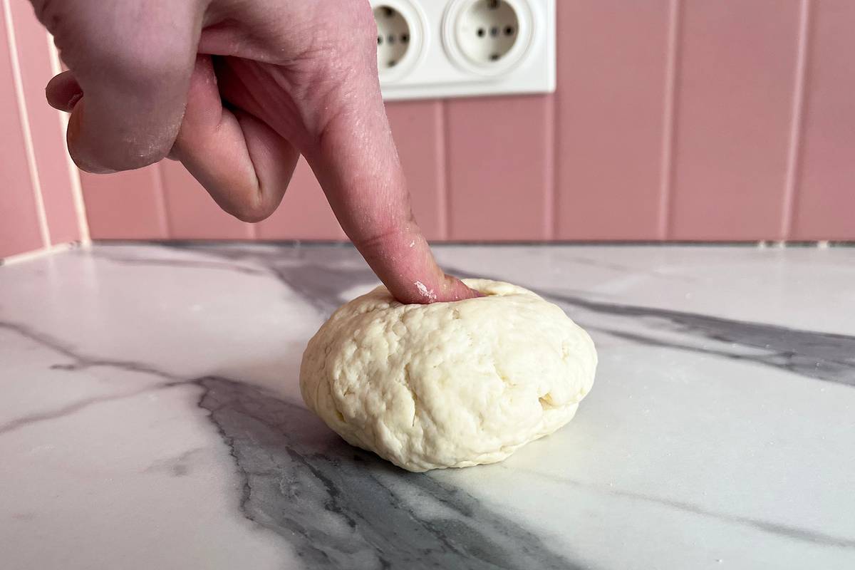 Я обычно давлю на тесто нижней частью ладони, но делайте как нравится. Можно растягивать, сминать или скатывать в шарик, а можно мять одной рукой.