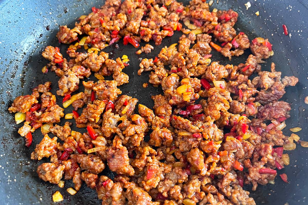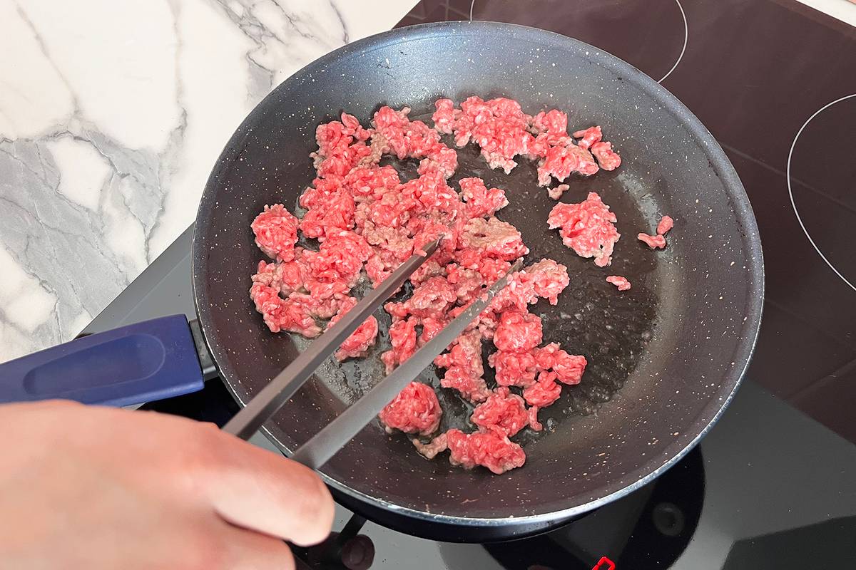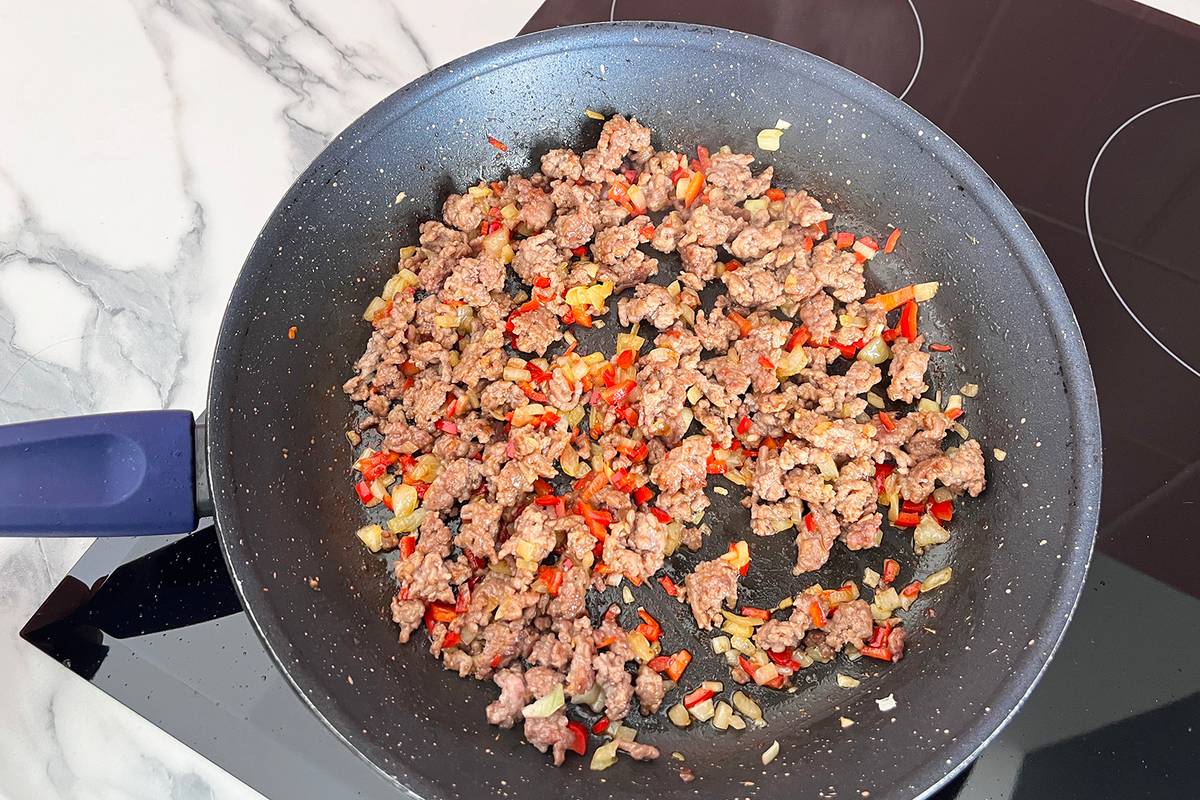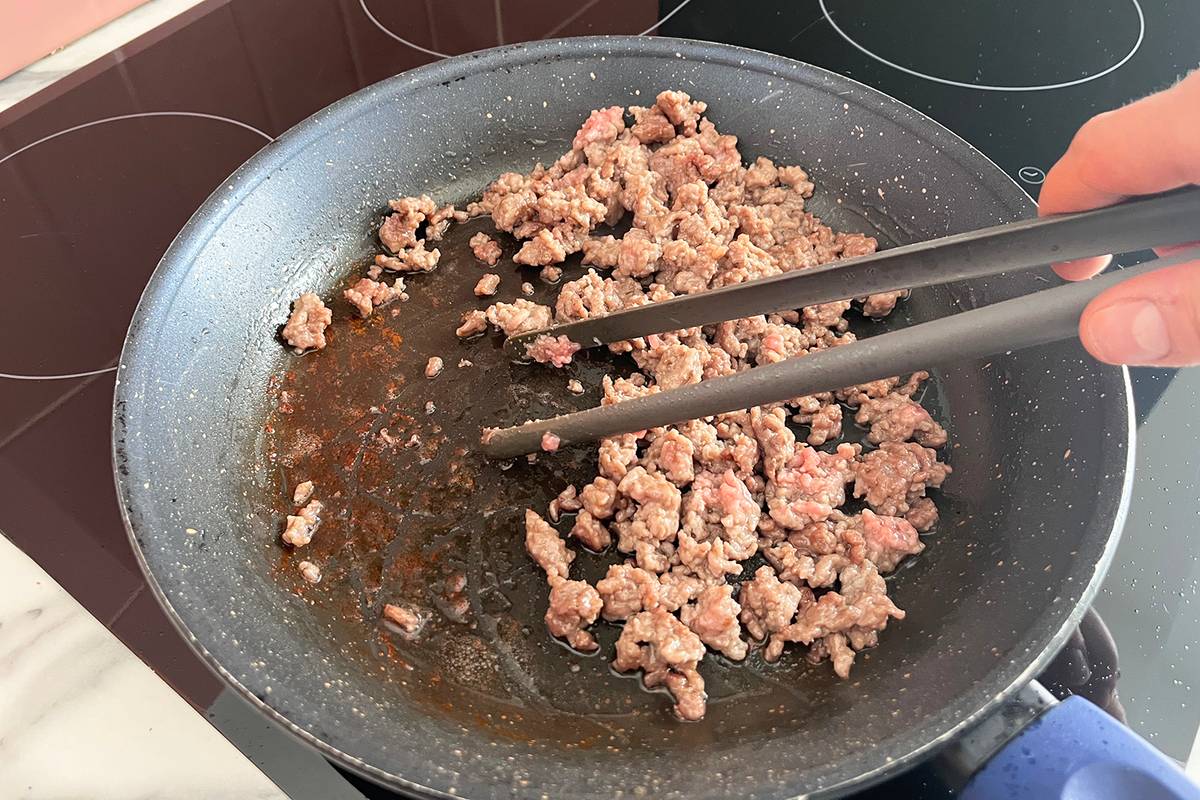 Шаг 1. Налейте в сковороду немного растительного масла — я жарю на оливковом — и сильно нагрейте ее. Выложите фарш и разомните на небольшие кусочки. Задача — как следует подрумянить мясо, чтобы на дне сковороды образовалась поджарка. Она растворится в подливке и добавит аромат.