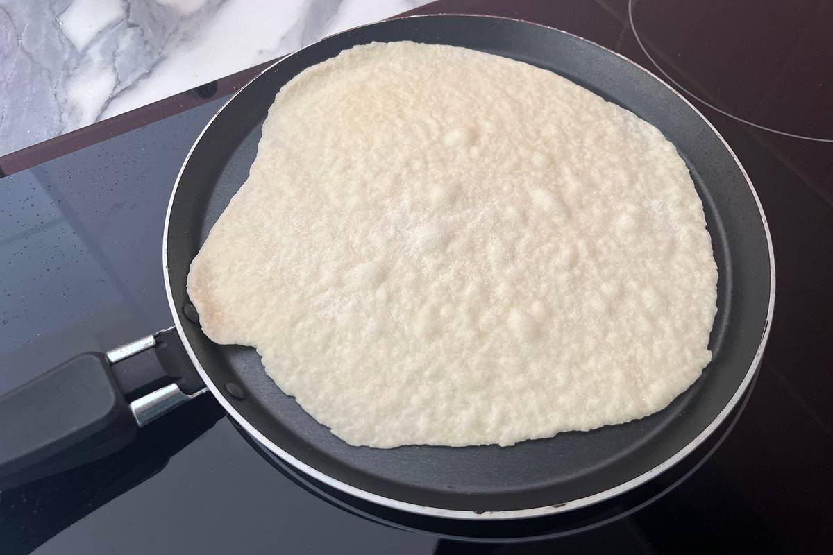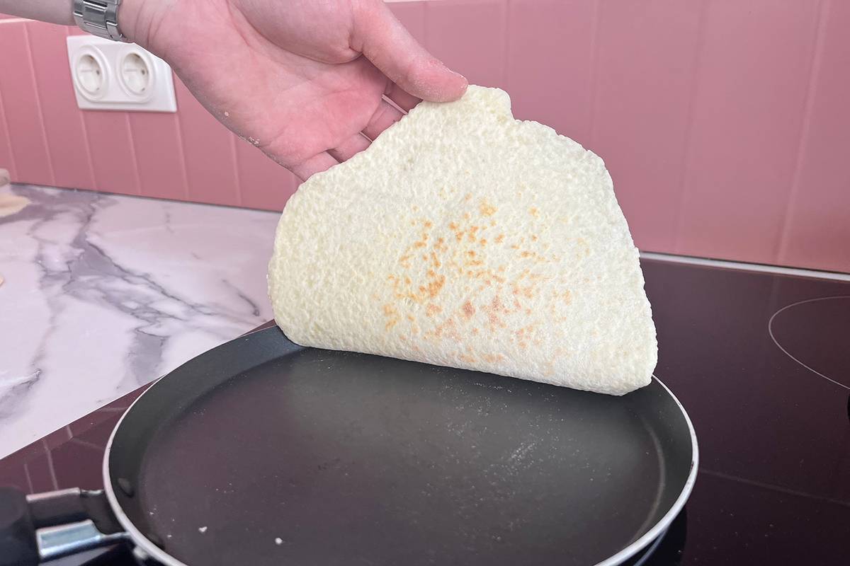 Точного времени приготовления нет: оно зависит и от толщины теста, и от посуды. У меня на одну лепешку ушло примерно 2 минуты. Тесто пора переворачивать, когда оно подсохнет и немного запузырится сверху.