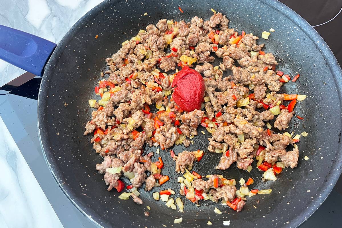 Шаг 4. Добавьте к мясу и овощам полторы чайные ложки томатной пасты. Все как следует перемешайте и обжарьте еще пару минут. Чтобы томатная паста дала больше вкуса, ее важно сначала прогреть, а уже потом залить водой.