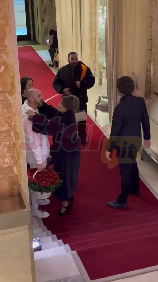 Когда появилась виновница торжества, у самого входа ее встретил с распростертыми объятиями Прохор Шаляпин. С улицы Боня пришла в черной шубе, но под зимним одеянием у нее пряталось праздничное мини-платье жемчужного цвета.