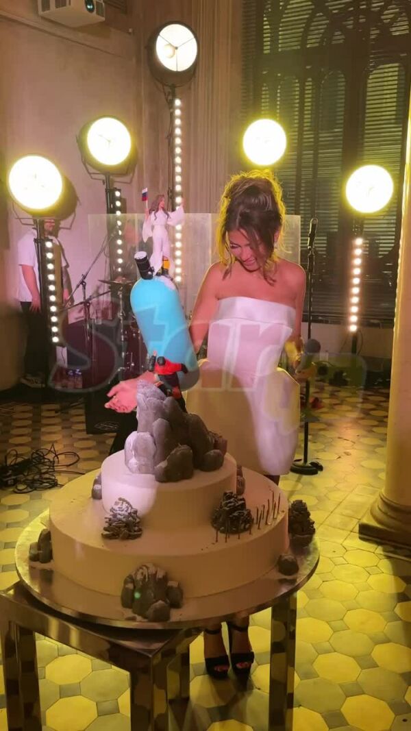 Под конец торжества имениннице наконец вынесли праздничный торт, сделанный Ренатом Агзамовым. Он был посвящен последним достижениям Вики. С разных сторон угощение украшено камнями и скалами. Оформленное в белом цвете символизирует снежную гору. К ее вершине карабкается альпинист, который несет на спине кислородный баллон, а на вершине стоит Вика.