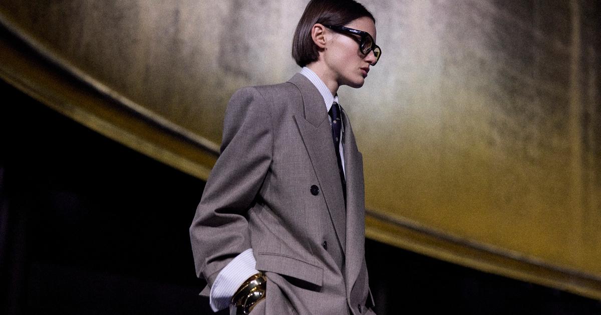 Se succèdent les costumes croisés à larges épaules et revers généreux, pantalon ample léchant le sol, chemise à grand col et cravate à motifs, à rayures, à pois ou unie que l'on croisait dans les quartiers d'affaires des années 1980. Les mannequins ont les mains dans les poches, et des lunettes aux montures massives inspirées du célèbre modèle en écaille d'Yves. Les manches de chemise sont retournées sur celles de la veste, la cravate est rentrée dans la ceinture. Les complets sont taupe, bleu marine, gris, ou parfois désassortis - et c'est encore plus beau. Passé par-dessus, un bomber, une veste de pilote, un blouson en cuir ou un trench… La saison dernière, Vaccarello avait créé « un » seul look tout en bas nylon, quasiment impossible à produire et qui posait la question de ce que les clientes de la maison pouvaient s'acheter. Là, elles auront donc du tailleur, de la chemise et du blouson, mais aussi quelques robes bain de soleil gipsy chic en noir et imprimés tapisserie très sombres, portées avec veste en cuir et colliers à la Loulou de la Falaise. Également, de très jolies vestes sans col, en brocart bicolore (vert et fuchsia, pourpre et safran, bourgogne et bronze…) à gros boutons verroterie telles de lointaines cousines des fameuses vestes hommage à Van Gogh. Elles viennent réchauffer des blouses de dentelle dégageant les épaules et des minijupes en volants de soie d'où dépassent des fonds de robe, avec toujours cette envie de flirter avec les conventions bourgeoises - ce qui ne provoquera jamais autant de remous que la collection Scandale de 1971, qui avait choqué l'establishment avec ce qu'on disait être inspiré des prostituées des années d'Occupation… Si ce débat est depuis longtemps dépassé dans l'industrie qui parfois se complaît même dans le laid, le seul mauvais goût, ici, c'est la maigreur de certains mannequins de la fin, et en particulier cette très jeune fille blonde dont on doute franchement que l'IMC respecte la charte commune signée par Kering et LVMH en 2017.