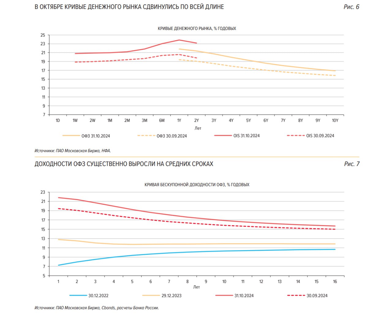 ● Ставки денежного рынка от 6 месяцев превысили уровень в 23% - плюс 2.7 п.п к сентябрю. Ввиду значительного смещения баланса рисков в сторону проинфляционных рынок допускает, что пик ужесточения ДКП еще не пройден.