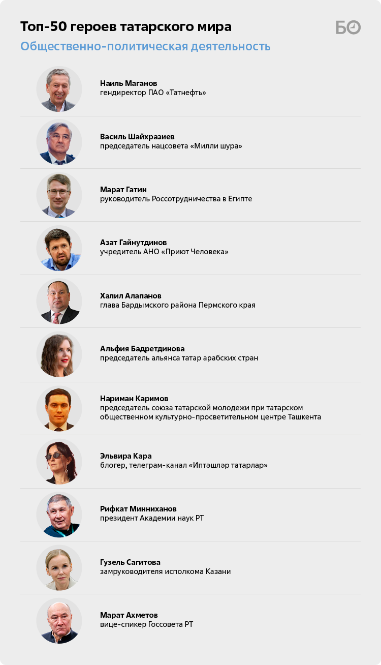 Открывает список в этом разделе гендиректор ПАО «Татнефть» Наиль Маганов. Генерал татарстанской нефтянки и его компания плотно занимается общественно-полезными делами. Важным событием лета для мусульман республики стало открытие после реконструкции центральной мечети Альметьевска им. Р. Фахретдина. Белокаменное религиозное сооружение вместимостью до 1,2 тыс. человек обновилось концептуально и архитектурно, став одним из самых современных и стильных мечетей республики. Благодаря нефтяной компании поддерживаются и культурные инициативы такие, как этно-модерн фестиваль «Каракуз», и творческие порывы отдельных коллективов, в числе которых Альметьевский татарский драмтеатр и этномузыкальный ансамбль «Кадим Альмет».