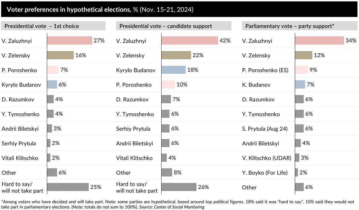 Экс-главком ВСУ Валерий Залужный в два раза обходит Владимира Зеленского (42% против 22%) на гипотетических выборах президента Украины, согласно опросу украинского Центра общественного мониторинга. Это касается и гипотетической партии под руководством нынешнего посла Украины в Великобритании. При этом, в рейтинге обоих кандидатов догоняет глава ГУР Минобороны Украины Кирилл Буданов (18%). В четвёрке лидеров также традиционно Пётр Порошенко (10%).