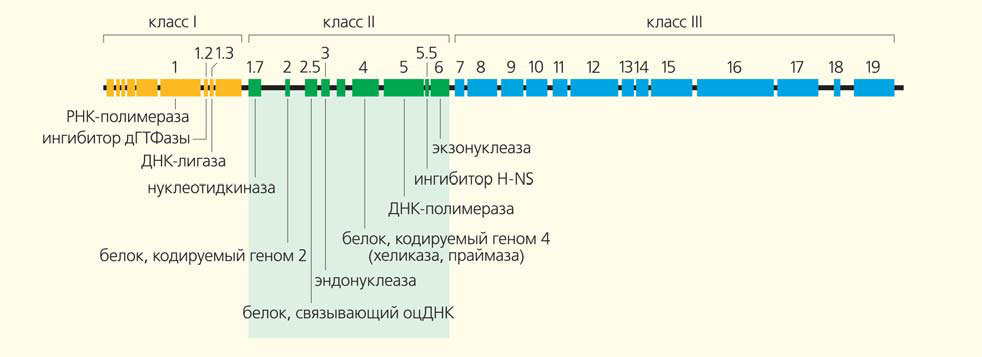 Риc. 6. Геномная карта бактериофага Т7 — это и история его жизни «слева направо» [8]