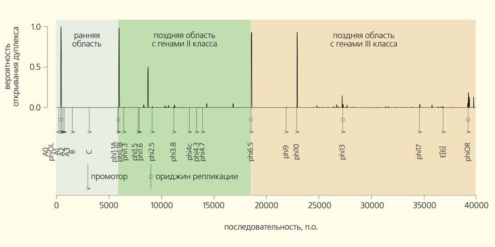 Другая закономерность затрагивает репликацию, для которой Т7-ДНК также является хорошей моделью. Этот геном имеет специализированный ориджин (точку начала репликации), отдаленный от 5′-конца на 17% длины генома. Однако его копирование может начинаться также в ряде других точек — и это как раз таки некоторые промоторы. Удивительно, но именно они относятся к числу дестабилизированных. Удивительно и осмысленно, поскольку репликация также может требовать особых физико-химических свойств дуплекса. В частности, легкость плавление дуплекса ДНК здесь точно не помешает [2].