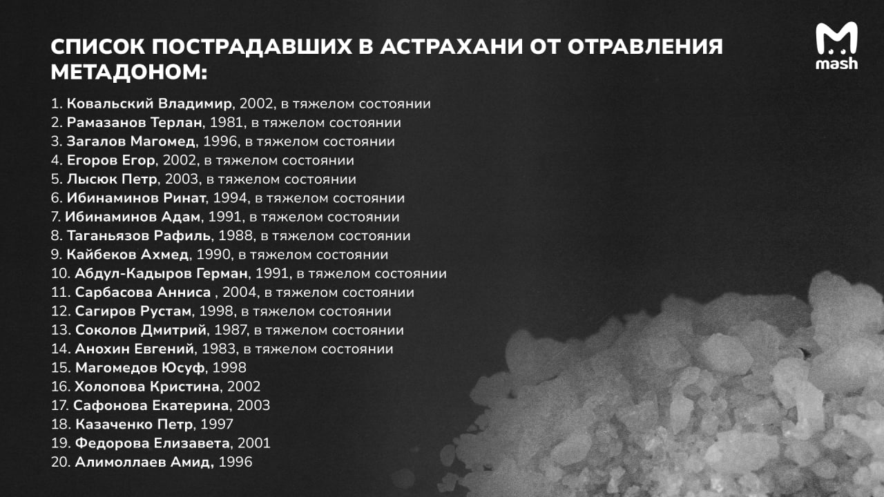 Всего в результате отравления наркотиком погибло три человека, пострадало 20 — четыре девушки и 16 молодых людей. Самому старшему из них 42 года, младшему — 19.