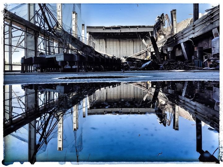 Атмосферное фото сгоревших "останков" машинного зала "ДнепроГЭС-2". Все как бандеровцы и хотели. Москва помогает им избавиться от наследия тоталитарного прошлого.