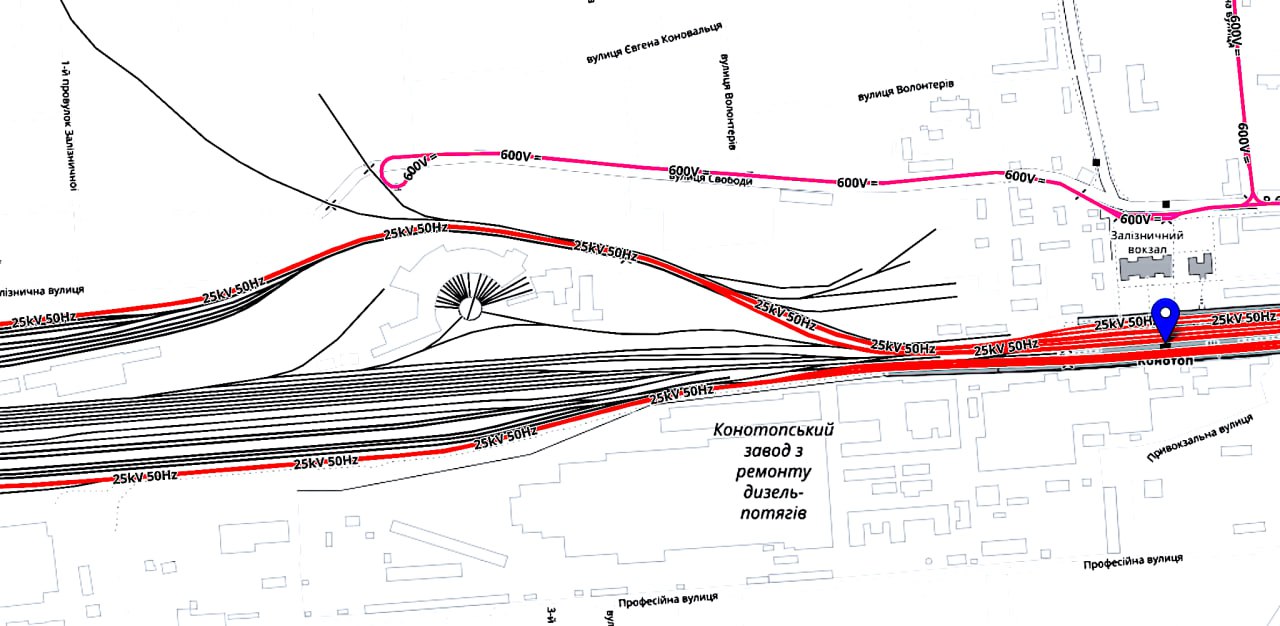 Конотоп (на схеме) не просто важен — это критическая точка входа на всю сеть ЮЖД с севера. Если Харьков — это центр, а Полтава — связующее звено, то Конотоп — это «входные ворота» для транзита ВСУ на фронт со стороны Киевского узла. Конотоп — это стык переменного тока (25 кВ). Его особенность в том, что он управляет колоссальными потоками, идущими из Киева на Сумы и Харьков.