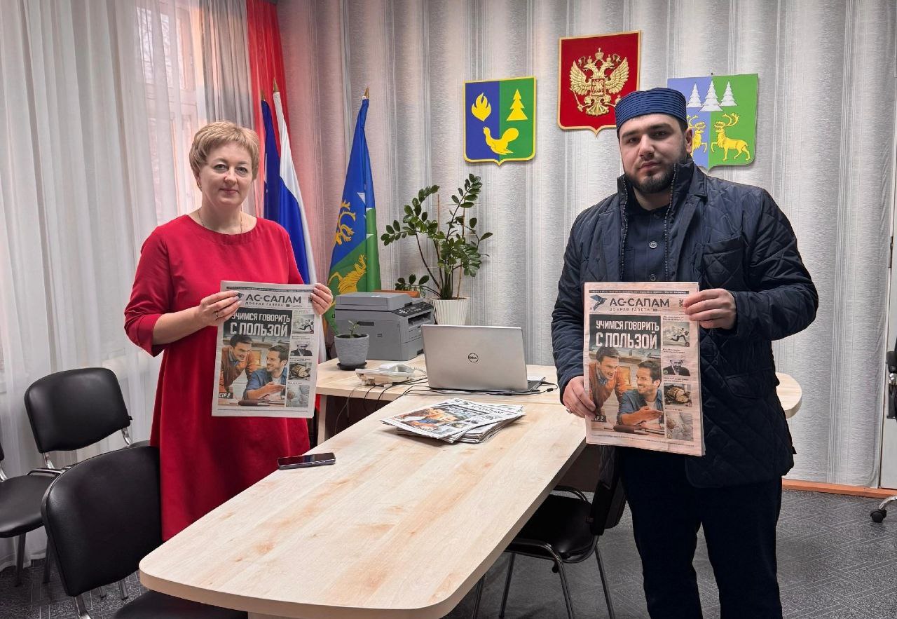 А вот с газетой в руках позирует глава администрации поселка Коммунистический Ханты-Мансийского АО Оксана Карачевцева и радостно рапортует о встрече с имамом Ибрагимом Хазратом Хайбулаевым.