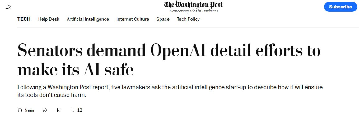 Об этом сообщает издание The Washington Post. После утечки данных о разработке ИИ, пять законодателей потребовали описать, как создатели обеспечивают безопасность, в том числе от вреда, который может нанести сам ИИ.