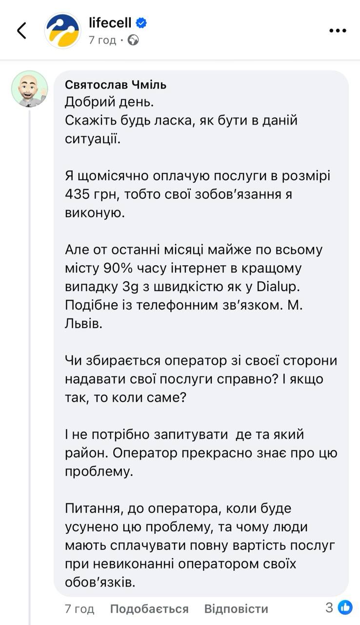 «Я ежемесячно оплачиваю услуги размере 435 грн, то есть свои обязанности я выполняю. Но последние месяцы почти по всему городу 90% времени интернет в лучшем случае 3G. Собирается ли оператор предоставлять свои услуги исправно?»,