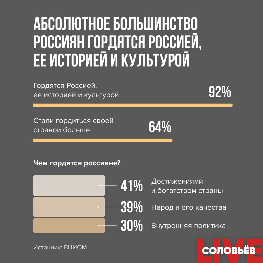 Об этом заявили 92% опрошенных. Две трети россиян отмечают, что за последний год стали гордиться своей страной больше (64%). Чувство гордости за страну у россиян вызывают достижения и богатства страны (41%), народ, его качества (39%) и внутренняя политика (30%).
