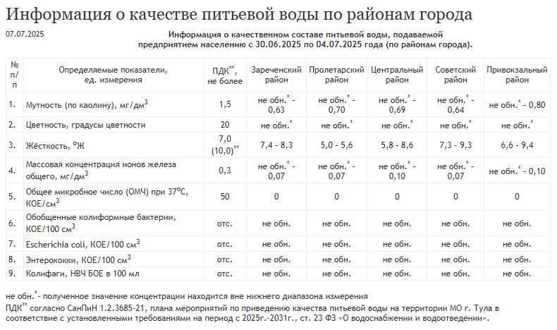 С 30 июня по 4 июля 2025 года максимальная жесткость воды была зафиксирована в Привокзальном и Советском округах Тулы, а максимальная мягкость — в Пролетарском.