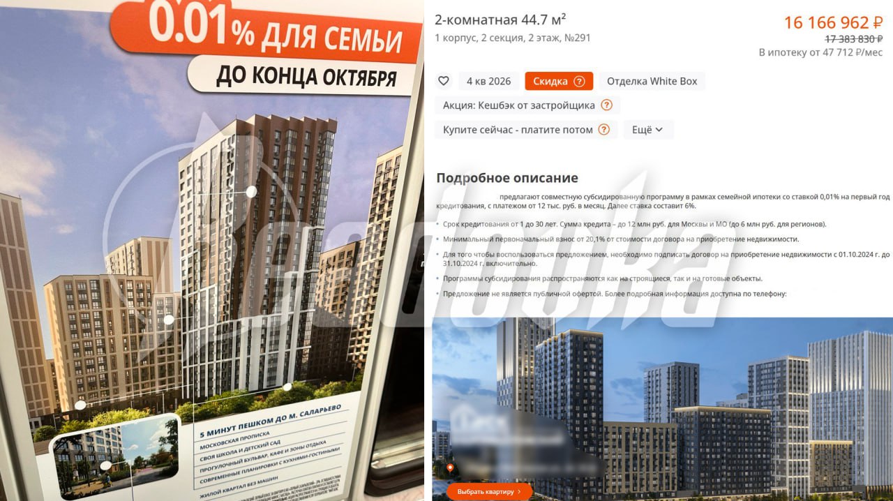 Согласно отчету аналитических компаний, продажи квартир в строящихся домах в России в период с июля по сентябрь 2024 упали в два раза в сравнении с аналогичным периодом прошлого года. В условиях повышенной ключевой ставки и падения продаж девелоперы ищут любые способы завлечь новых клиентов. Один из них рекламирует семейную ипотеку в подмосковных комплексах под процентную ставку в 0,01% на первый год, далее — 6%. Но это не так: на деле к 6% добавятся допрасходы, которые если и прописаны в объявлении, то мелким шрифтом.