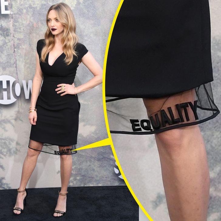 На премьере сериала «Твин Пикс» в 2017 году Аманда Сейфрид появилась в скромном черном платье, выделяющемся очень заметной деталью. На его подоле было вышито слово «Равенство». Считается, что таким образом девушка хотела привлечь внимание к проблеме разницы гонораров актеров и актрис. На своей страничке в соцсетях она выложила фото с премьеры и подписала его так: «Твин Пикс, равенство и бриллианты для всех».