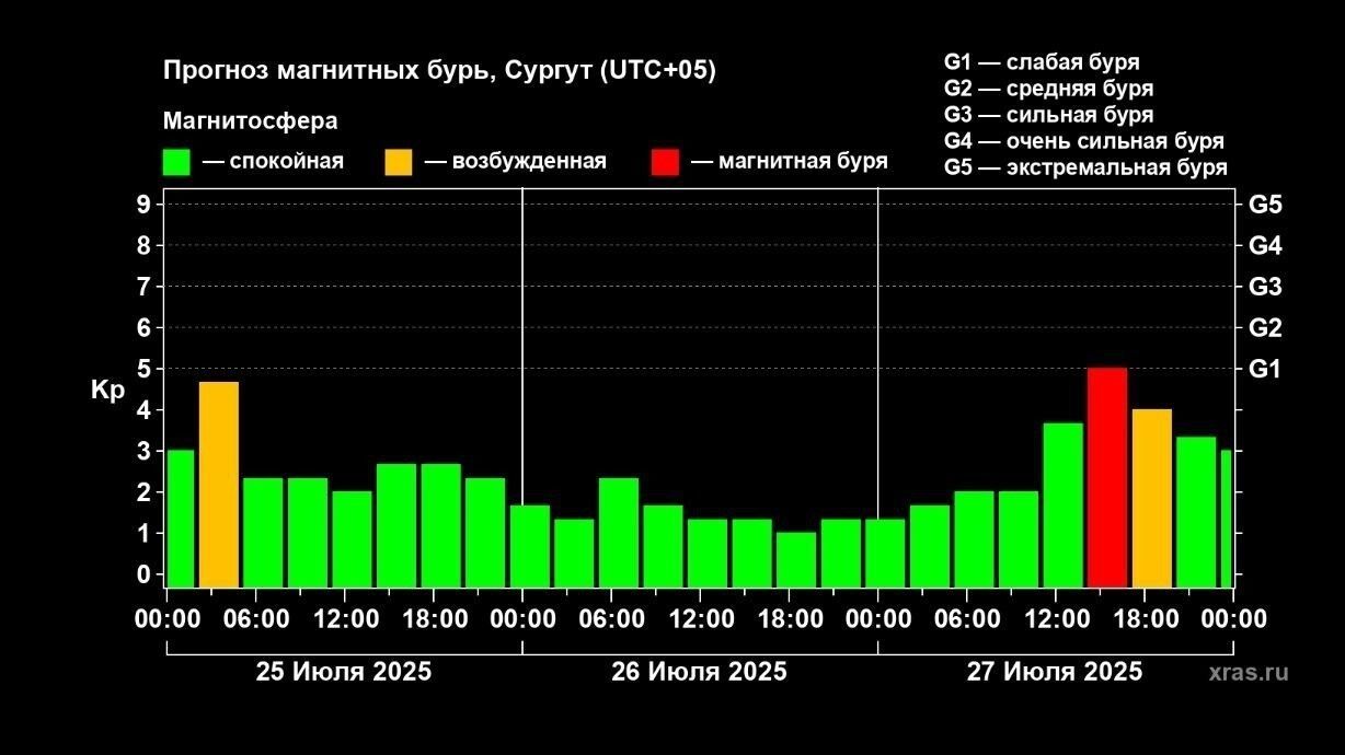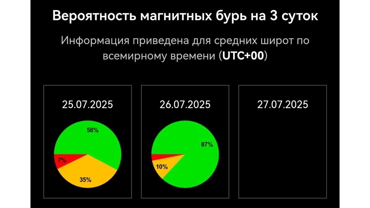 В субботу, 26 июля, метеозависимых югорчан ждет спокойный день отдыха. Магнитосфера будет находиться в зеленой зоне: вероятность бурь — почти нулевая. Это следует из ежедневного прогноза Лаборатории солнечной астрономии ИКИ и ИСЗФ.