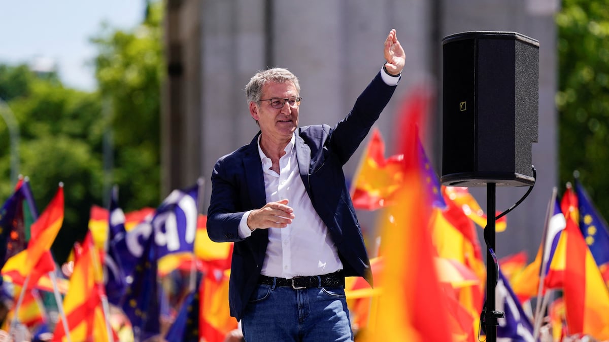 Este domingo, Feijóo ha mezclado todos esos ingredientes en el discurso dado ante los concentrados que han copado la Puerta de Alcalá y parte de la calle de Alcalá en dirección a la Gran Vía, aunque sin alcanzar la fuente de Cibeles. “El Estado no es Pedro Sánchez. Los españoles debemos tener garantías, la garantía de que nadie es más que nadie. Ni por muy necesarios que sean un puñado de votos. Esta es la respuesta que tenemos que dar el 9 de junio”, ha dicho el jefe de la oposición llamando a la movilización ante la próxima cita en las urnas europeas, que el PP quiere convertir en un plebiscito contra el presidente. “Improvisa algo tan serio como el reconocimiento de un Estado simplemente porque tenía que comparecer para dar explicaciones de su Gobierno, de su partido y su entorno”, ha lanzado el líder del PP, que ha acusado a Sánchez de “utilizar al pueblo palestino para intentar cambiar el titular”.