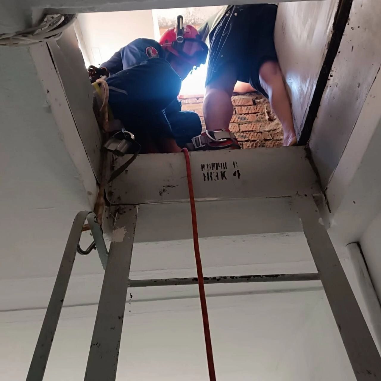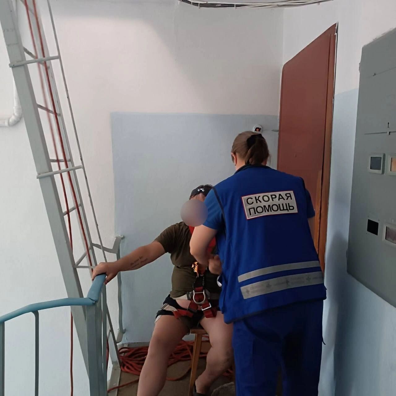 Спасатели надели на пострадавшего страховочную систему и спустили его на лестничную клетку. Там его уже ждала бригада скорой медицинской помощи.
